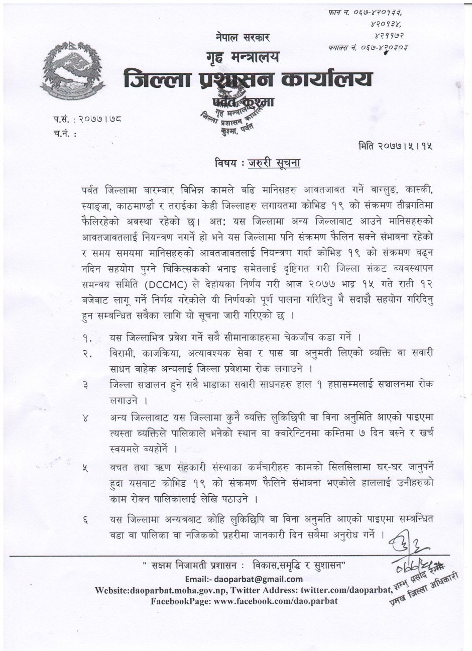 पर्वत जिल्लमा कोरोना भाइरसको संक्रमण फैलन सक्ने सम्भावनालाई मध्यनजर गर्दै जिल्ला संकट व्यवस्थापन समन्वय समिति (DCCMC) ले मिति २०७७ भाद्र १५ गते राति १२ बजेदेखि लागू हुने गरी निम्न निर्णयहरु गरेको हुदा सो को परिपालनाको लागि यो सूचना गरी गरिएको छ ।