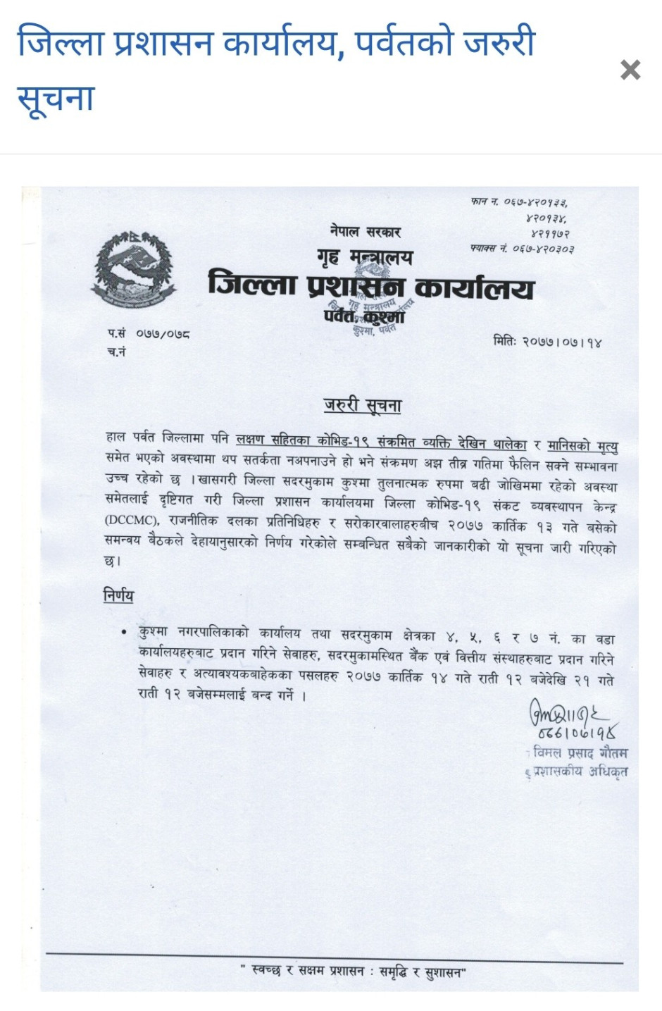 वडाहरूले प्रवाह गर्ने सेवा तथा बैंकिगं सेवा बन्द गरिएको सम्बन्धी जिल्ला प्रशासन कार्यालयको सूचना